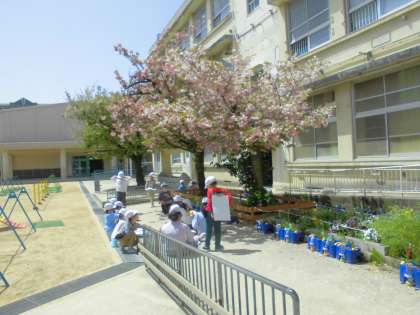 運動場にある桜の木は、種類の異なる木がまだ咲いています。