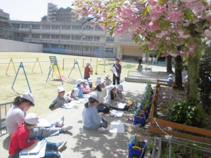 2年2組のみんなは探検バックに画用紙を貼り、スケッチをしました。
