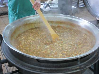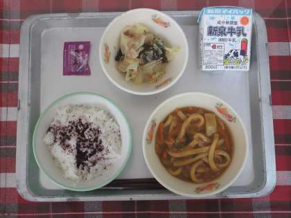 カレーうどんは大人気メニューです。どのクラスもとてもよく食べていました。いそのサラダは新メニューです。「磯」に関係のある、かつお(油漬)・花かつお・わかめが入っています。お味はいかがでしたか?