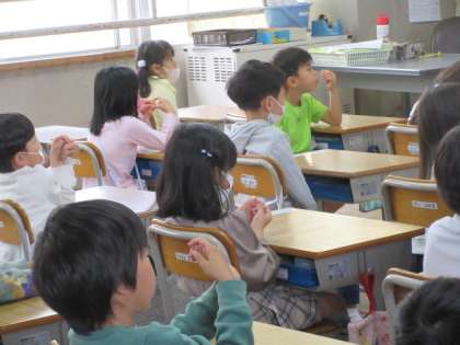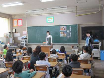 1年1組が給食の先生と一緒に