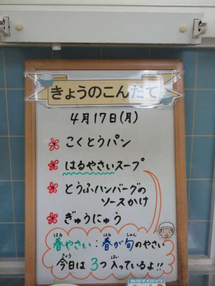 今日から1年生の給食が始まりました。今日のスープは「春野菜スープ」です。春が旬の「きぬさや」「キャベツ」「たまねぎ」が入っています。春野菜は、やわらかくて甘みがあります。