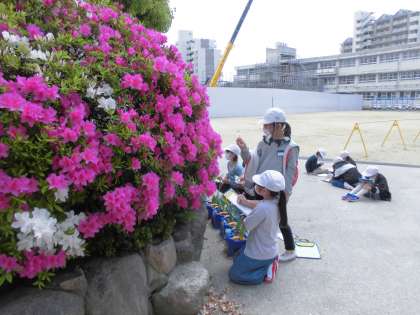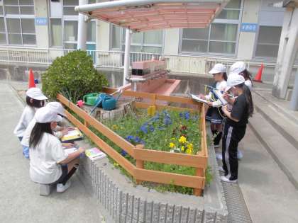 ツツジやパンジーなどの花の作りに気を付けながらスケッチをしていました。