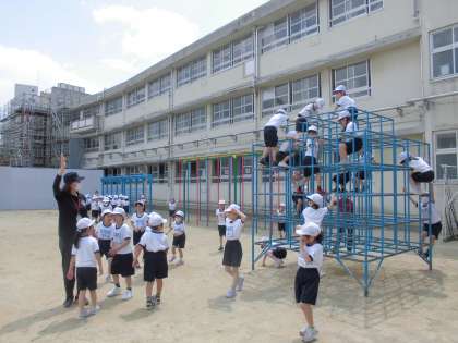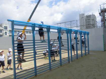 運動場にある固定遊具を使って遊んでいました。