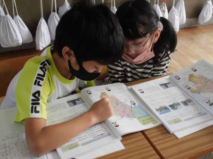 今日も、教科書の資料をもとに人の多いところと少ないところの土地の使われ方の違いを考えました。自然と隣の友だちとお互いの考えを伝えあっていました。人が集まるところには、便利なことが多くてほとんどの人が、土地が低いところに住みたいと考えていました。