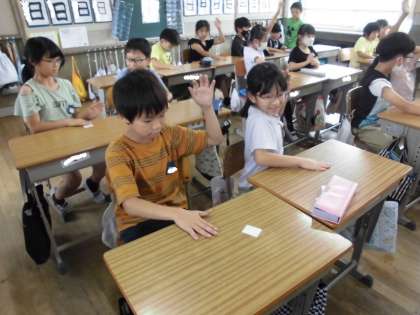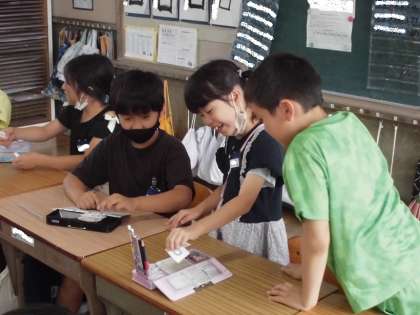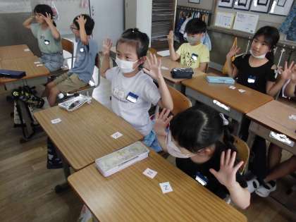 今日の学習では、アルファベットの発音と文字の形を学びました。NSの先生が発音したアルファベットをペアよりも早く見つけて取る活動を通して、覚えていきました。
