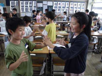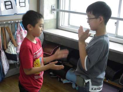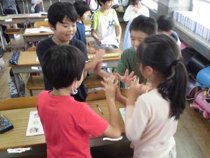 拍にのって、手遊びにしながら歌いました。前回はペアと手遊びを行っていたので、今日はグループで取り組みました。それぞれのグループで手遊びを工夫しながら明るい声で歌いながら楽しんでいました。