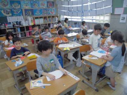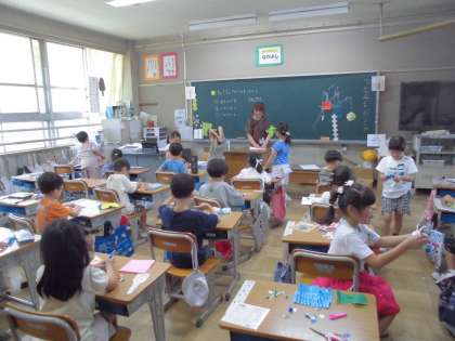 1年2組では、折り紙とはさみを使って飾りをつくりました。