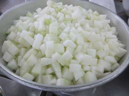 とうがんは、漢字で「冬」に「瓜」と書きますが、夏が旬の食べ物です。厚い皮に包まれていて、日陰の涼しいところだと、冬まで保存できることから「冬」という漢字が使われています。今日は中華風うま煮にしました。