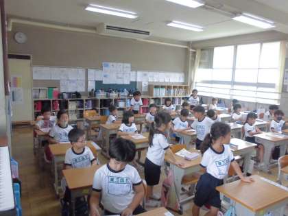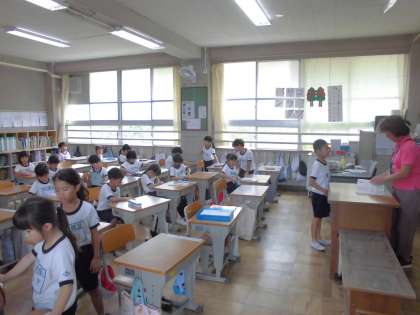 1年2組が身体測定を終えて教室へ戻ってきました。