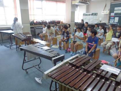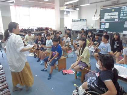 先生に木琴や鉄筋の叩き方を教わり、これから順番に音を出してみるところでした。