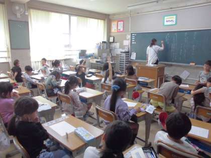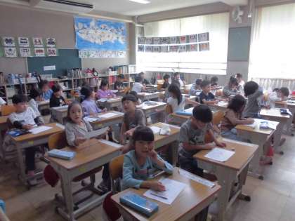 「いつ・どこで」、「とうじょうじんぶつ」など、項目に分かれたプリントにお話を整理して書き込んでいました。