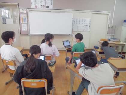 6年生はタブレットを使った卒業文集づくり。なかなか次の文章が出ず、思わず頭を抱える場面も。