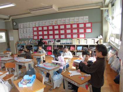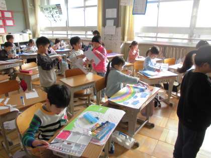 クレパスで書いた乗り物を切り取り、その裏にバネのように紙をつけたら、まるで絵の世界から飛び出してきたような作品ができています。