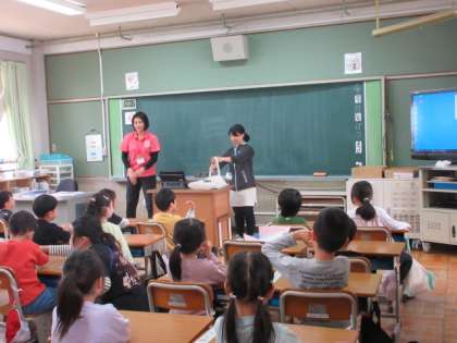 1年4組が給食の先生と一緒に
