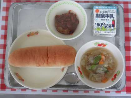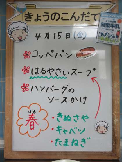 今日のスープは「春野菜スープ」です。春野菜とは、春が旬の野菜です。旬の食材は、たくさんとれて、味も良くなります。