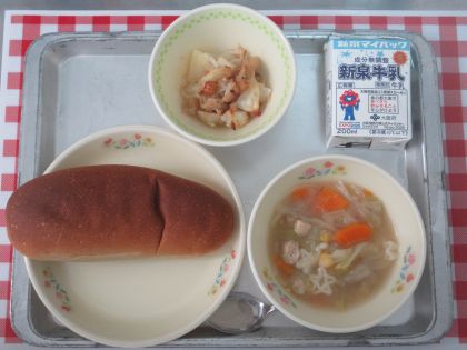 米粉マカロニスープには、とうもろこしが入っています。とうもろこしは栄養価が高く、主食のかわりにもなる野菜です。ビタミンB群や食物繊維などの栄養も含まれています。夏が旬の野菜ですが、缶詰に加工されるものも多く、給食でも1年中いろいろな献立に使用しています。