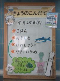 今日の給食は・ごはん・牛乳・みそ汁・いわしフライ・野菜炒めいわしは、和食になじみ...