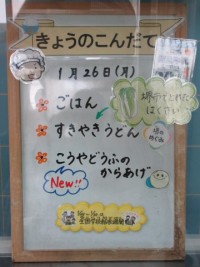 今日の給食は・ごはん・牛乳・すきやきうどん・高野豆腐のから揚げ高野豆腐は豆腐を一...