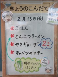 今日の給食は・ごはん・牛乳・とんこつラーメン・焼きギョーザ・キャベツのソテーギョ...