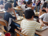 写真は、3年2組の当番さんが運んでいる様子と、2年の各クラスでの喫食時の様子です。「おいしいね!」とニコニコ笑顔で喫食していました。