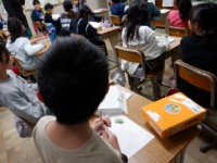 「土の種類と水のしみこみ方にはどんな関係があるのか」という問題に対し、土、すな、砂利に水をしみこませる実験に取り組んでいました。
