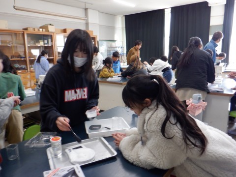 食塩とミョウバンを溶かし蒸発させて、とけたもののゆくえについて確かめていました。