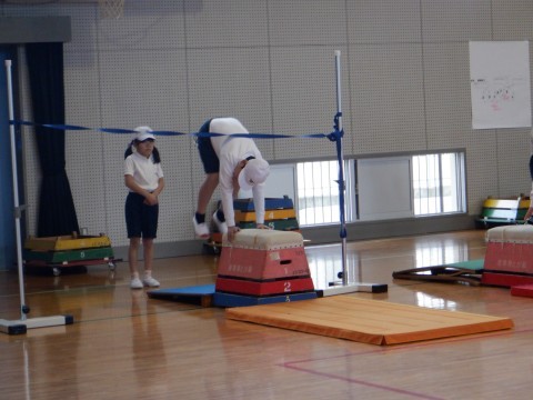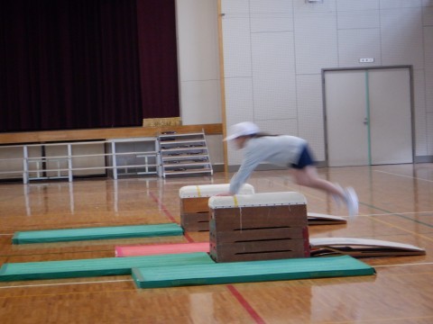 3年2組の体育では、開脚跳びに取り組んでいました。