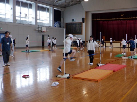 6年3組の体育では、走り高跳びに取り組んでいました。