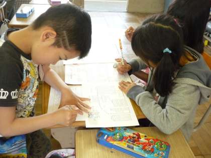1年生との学校探検で、どこの部屋からまわるのか、ペアで考えています。みんな真剣でした。