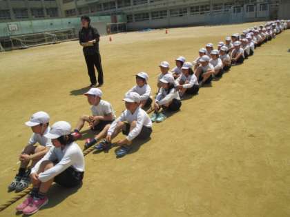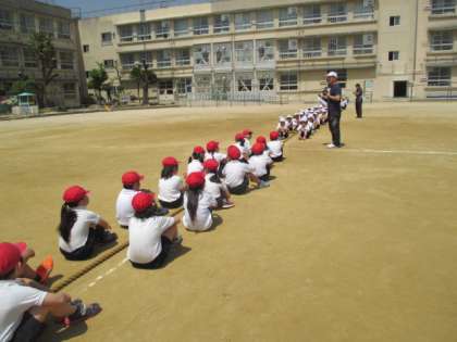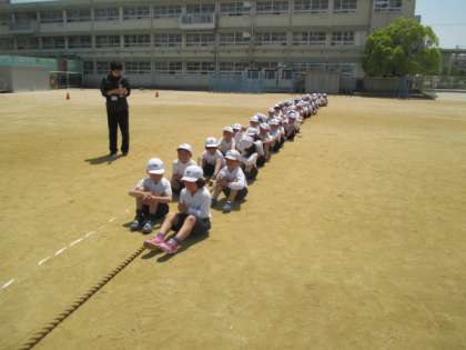 体育大会に向けた綱引きの練習をしました。並びや引きかたを覚えます。