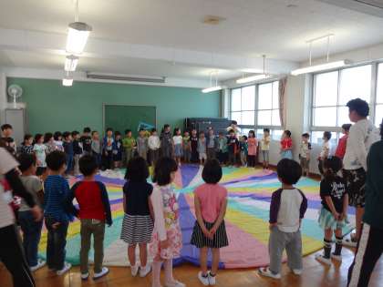 3時間目に、生活科ルームで一年生とのふれあい授業がありました。なかよし学級についての話を聞いたあと、一人ひとり自己紹介をし、最後はパラバルーンでふれあいました。