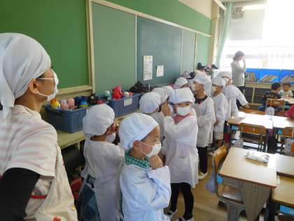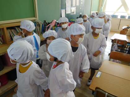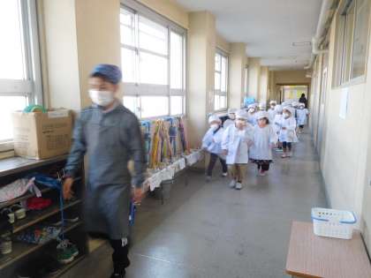 給食着に着替えたら,整列して給食場へ向かいます。静かに移動することを心がけましょう。