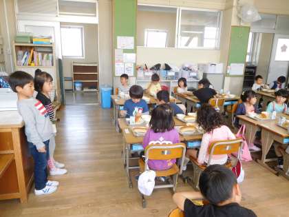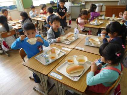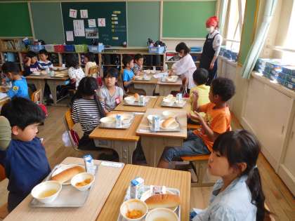 給食が運ばれてくるのをワクワクしながら待ちます。