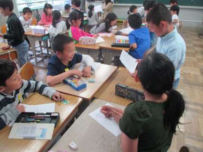 それぞれの考えたお店を発表します。「オオカミの遠吠え屋さん」「イルカの水中タクシー」など,アイディアいっぱいです。