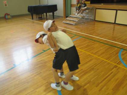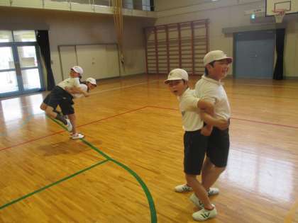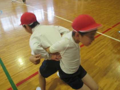 体育の初めは力づくりから始めます。ペアでの持ち上げも上手にできるようになってきました。