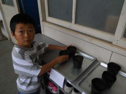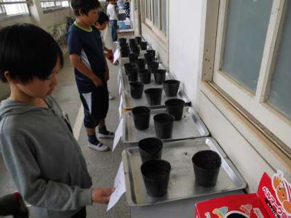ヘチマとヒョウタンの種を植えました。どのように成長するのか楽しみにしながら,水をあげました。これから班で責任をもって育ててほしいと思います。