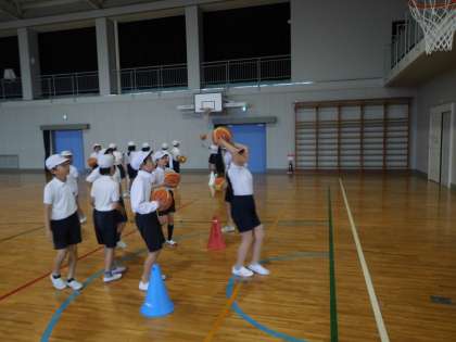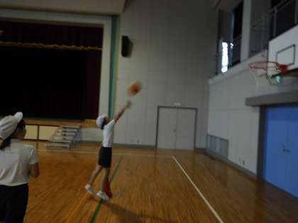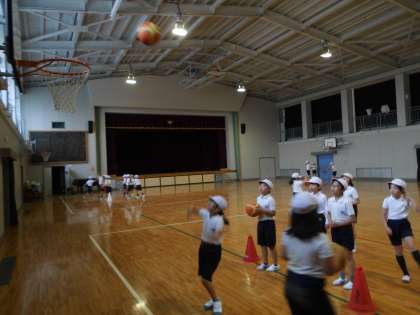 体育で,ボール操作の練習をしました。バスケットボールでドリブル,パス,シュートのコツを確かめながら練習しました。