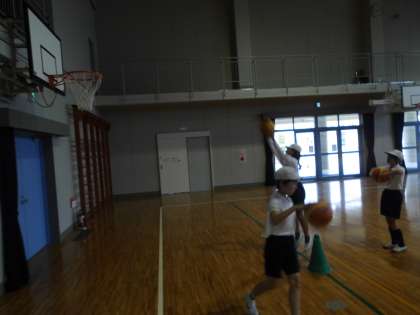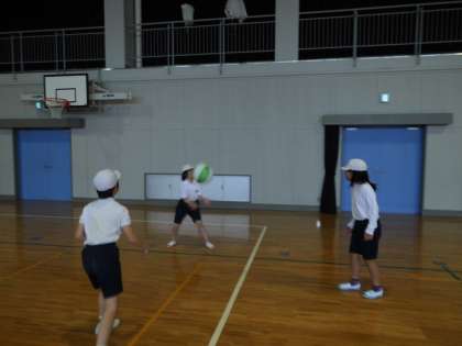 バレーボールのパスゲームもしました。チームで落とさずに何回つなげるか競い合いました。