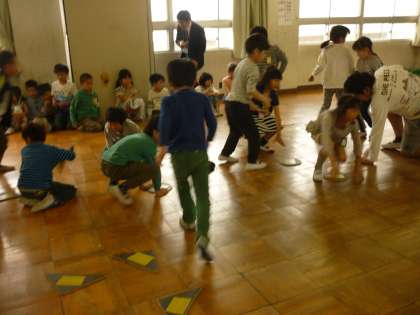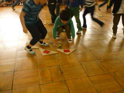 2年生とのふれあい遊びは「ひっくり返しゲーム」です。赤VS黄色に分かれて、マットを自分のチームの色にひっくり返していきます。勝負は盛り上がり、勝ったチームは大喜びでした。