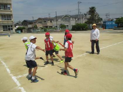 リレーの練習です。バトンパスがポイントですね。