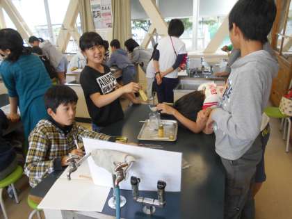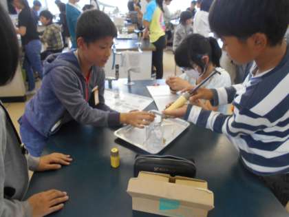 気体検知管を使って空気の成分を調べました。