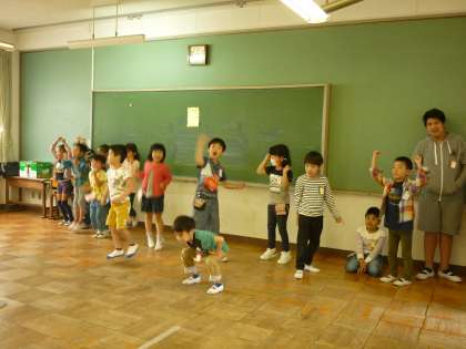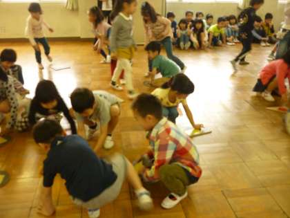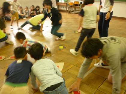 ふれあいあそびのひっくりかえしゲームです。みんな自分のチームの色をどんどん増やしていきます。勝ったチームはみんなで「やったー!!!」