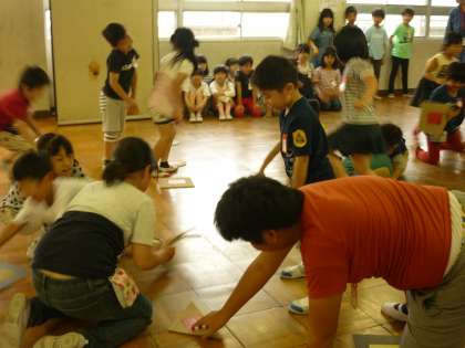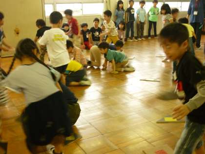 2年2組とのふれあいあそびです。スタートの合図でみんな一斉にマットをひっくり返し始め,大盛り上がりです。