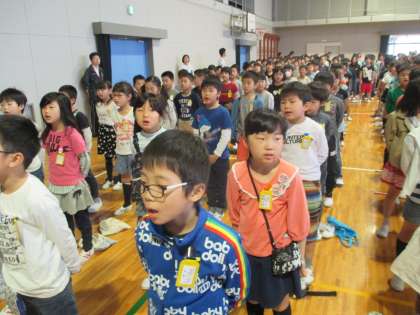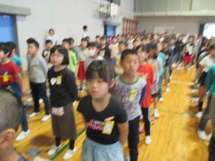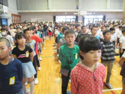 連休明けの全校朝会です。静かに素早く整列することができました。