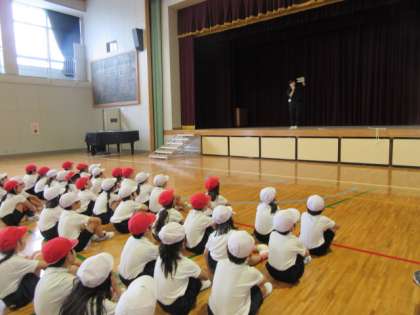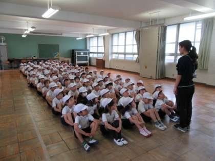 1時間目,運動場が雨で使えなかったので,ダンスや行進の並び方の練習を生活科ルームでしました。