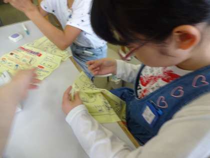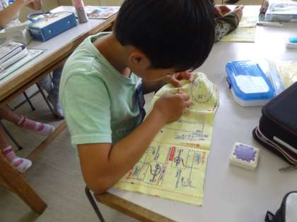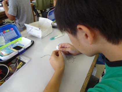 今日は針に糸を通して,玉留をしました。