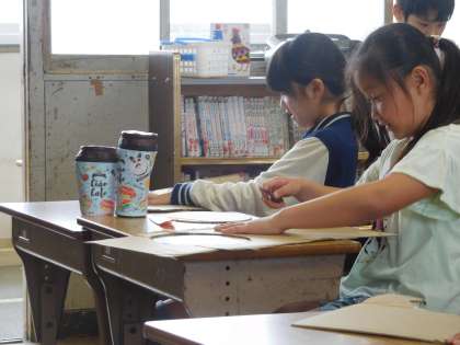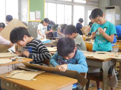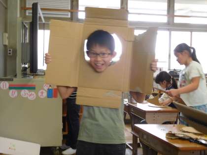 練習用の太鼓を作りました。段ボールカッターをうまく使いました。きれいに切れて嬉しそうに,ひょっこり顔を出しました。