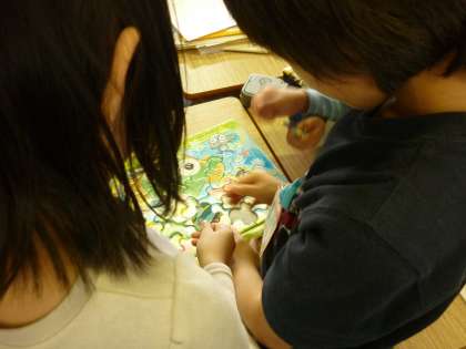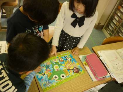 今日も休み時間に2年生のお友だちがなかよしに遊びに来てくれました。「こうかな?」「こうじゃない?」と考えながら、協力してパズルを完成させることができました。