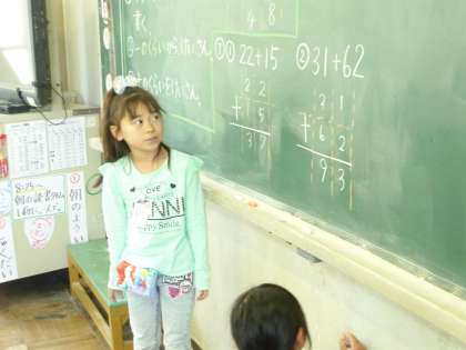 たし算のひっ算を学習しています。何度も練習が必要ですね。