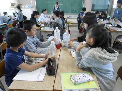 メダカの卵を育てる準備をしました。家から持ってきたペットボトルを水槽の代わりに使います。